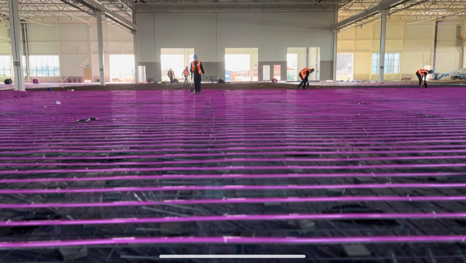 Voor Batenburg Installatietechniek verzorgen wij de complete vloerverwarming in dit project – en dat is bepaald geen klein werk. De hal alleen al wordt voorzien van maar liefst 87 kilometer roze 20 mm leiding, verdeeld over 23.980 m² vloeroppervlak met een hart-op-hartafstand van 30 cm. Daarnaast hebben we de kantoren meegenomen: daar installeren we 16 mm leidingen in de randzones, verdeeld over 22 groepen. Alles aangesloten op onze betrouwbare RIHO VK verdelers.
