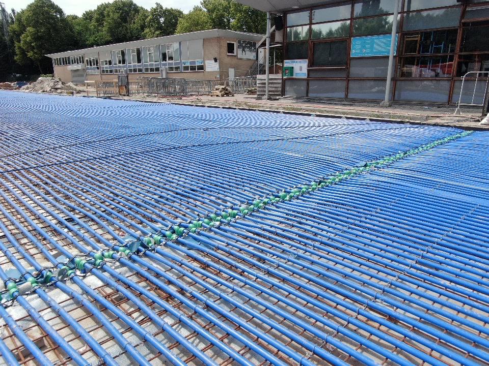 RIHO Climate Systems leverde 8 grote prefab verdelers, rechtstreeks vanuit de Aquathermfabriek, uitgevoerd in PP-R SDR 17.6 200×11.4 mm. Daarnaast werd meer dan 80 kilometer Aquatherm Blue Pipe leiding (PP-R SDR 17.6 25×3.5 mm) gemonteerd. De leidingen zijn met een h.o.h.-afstand van 80 mm gelegd, verdeeld over circa 680 groepen. Ook verzorgde RIHO de hoofdleidingen vanaf de nieuwe techniekruimte naar de headers.