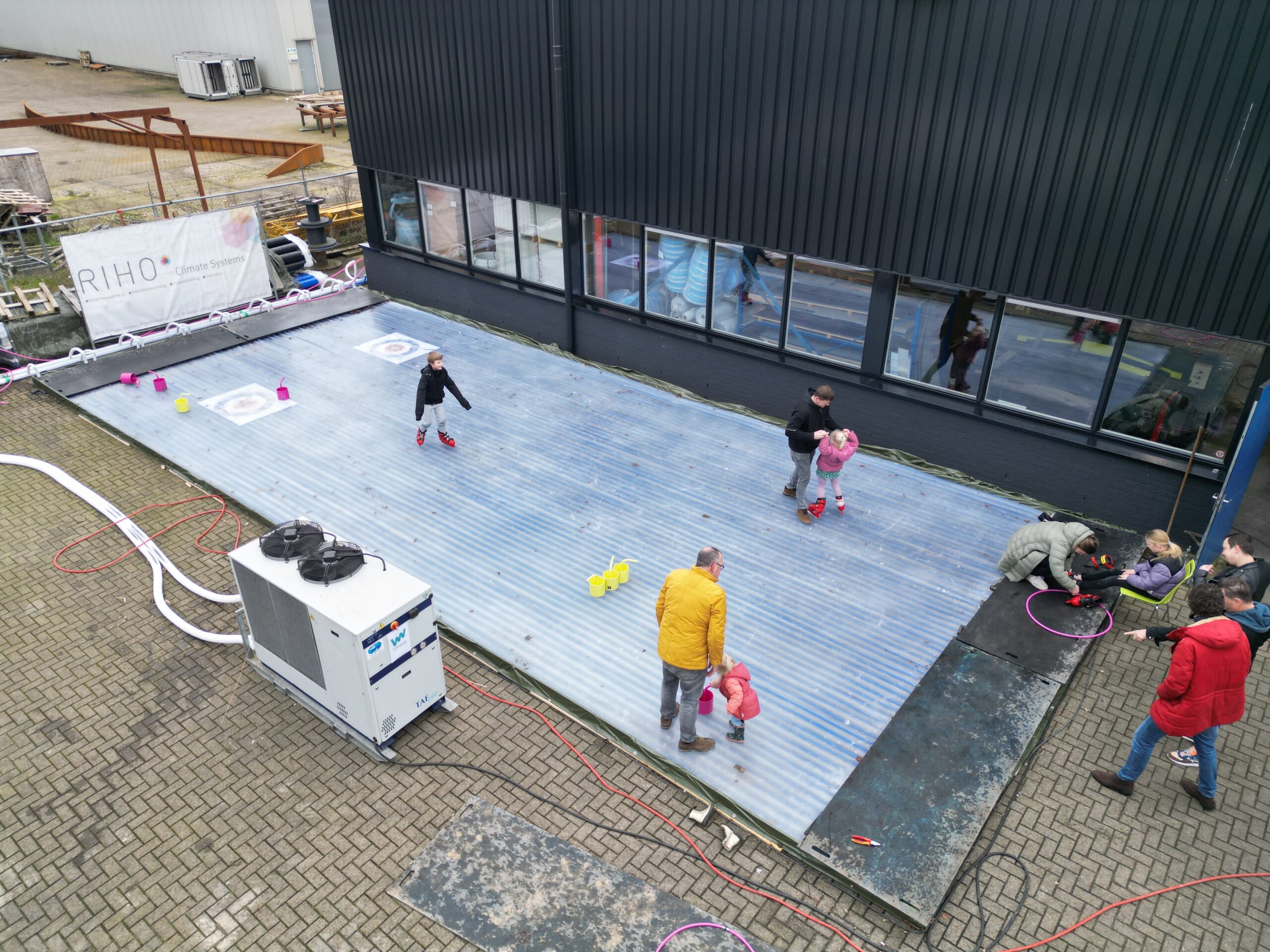 Om onze techniek dicht bij huis te laten zien, bouwden we achter ons pand in Vorden een complete ijsbaan. Van kilometers leiding tot een spiegelgladde vloer: hier ervaarden bezoekers hoe RIHO IJsbaantechniek in praktijk werkt.