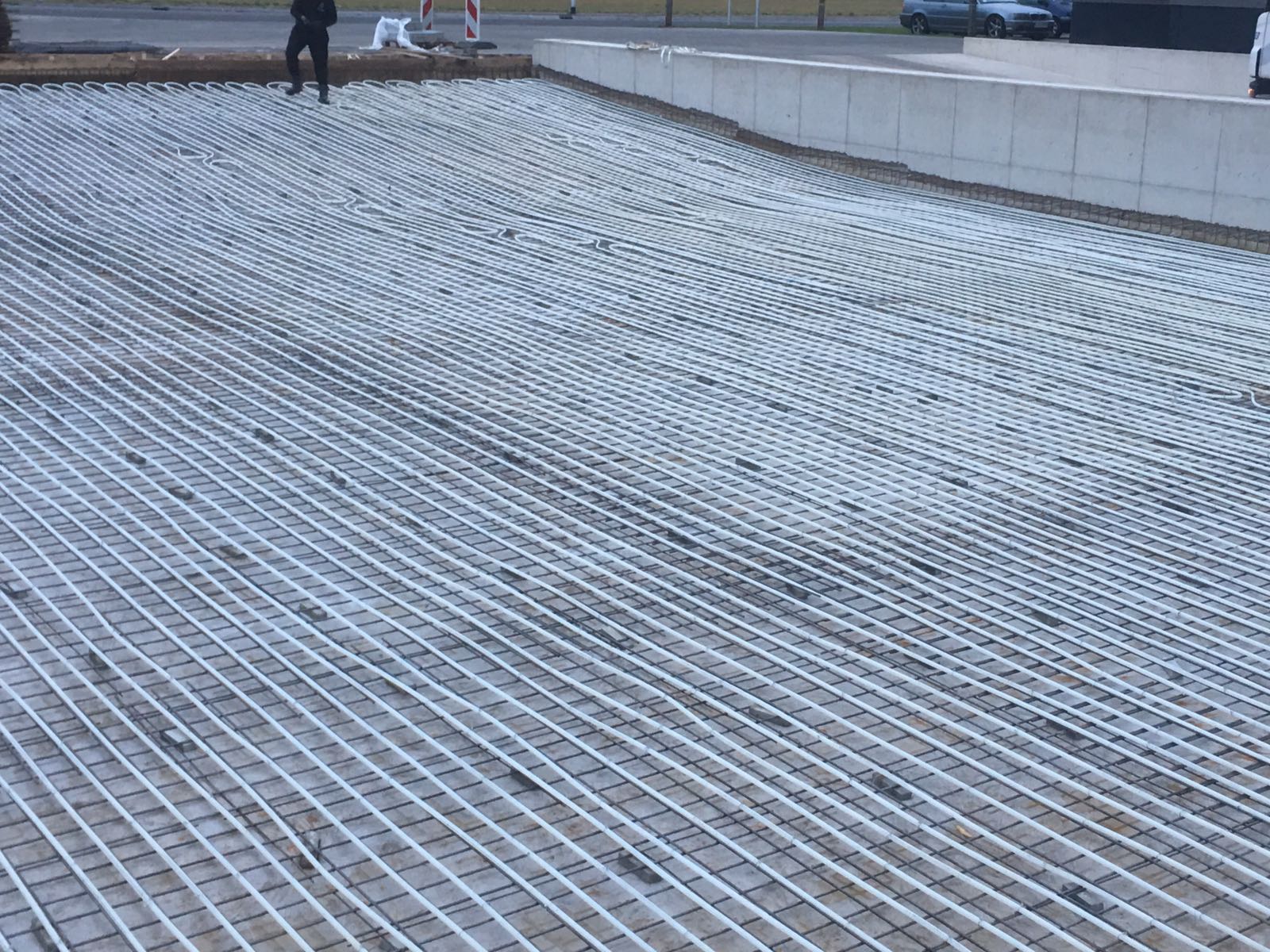 De leidingen worden bevestigd op gegalvaniseerde wapeningsnetten en in de hellingbaan van de oprit geïntegreerd. Ze zijn gekoppeld aan een verdeelstation met een platenwisselaar. Deze platenwisselaar scheidt het primaire verwarmingscircuit van het secundaire water-glycol circuit.