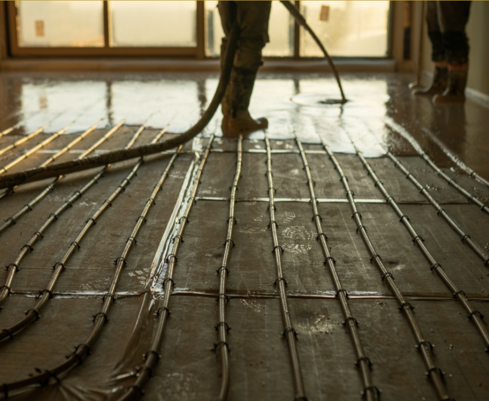 Bij dit systeem worden de vloerverwarmingsleidingen direct aan de constructieve onderwapening van de monolithvloer gemonteerd. Vervolgens plaatst de aannemer een bovennet op supporters, waarna de betonvloer wordt gestort. Om uitzetting van de vloer te voorkomen, wordt langs wanden en vaste punten randisolatie aangebracht op de juiste hoogte. Het resultaat is een duurzame vloerconstructie die bestand is tegen zware belasting en tegelijkertijd zorgt voor een gelijkmatige warmteverdeling.